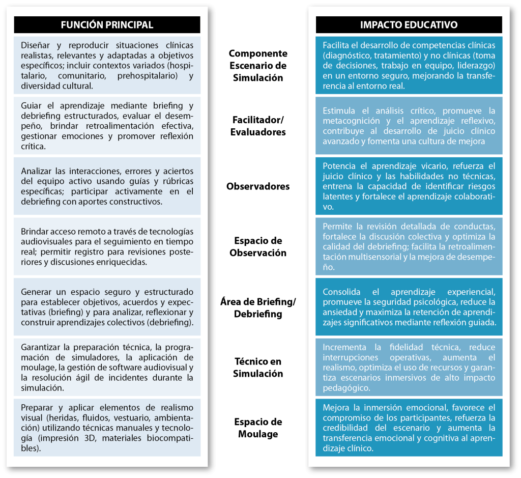- Observadores: No son meros espectadores; su rol requiere entrenamiento para reconocer dinámicas de equipo, detectar errores latentes y extraer lecciones aplicables a su futura práctica. Aprenden a usar guías de observación y a participar activamente en el análisis posterior [5].