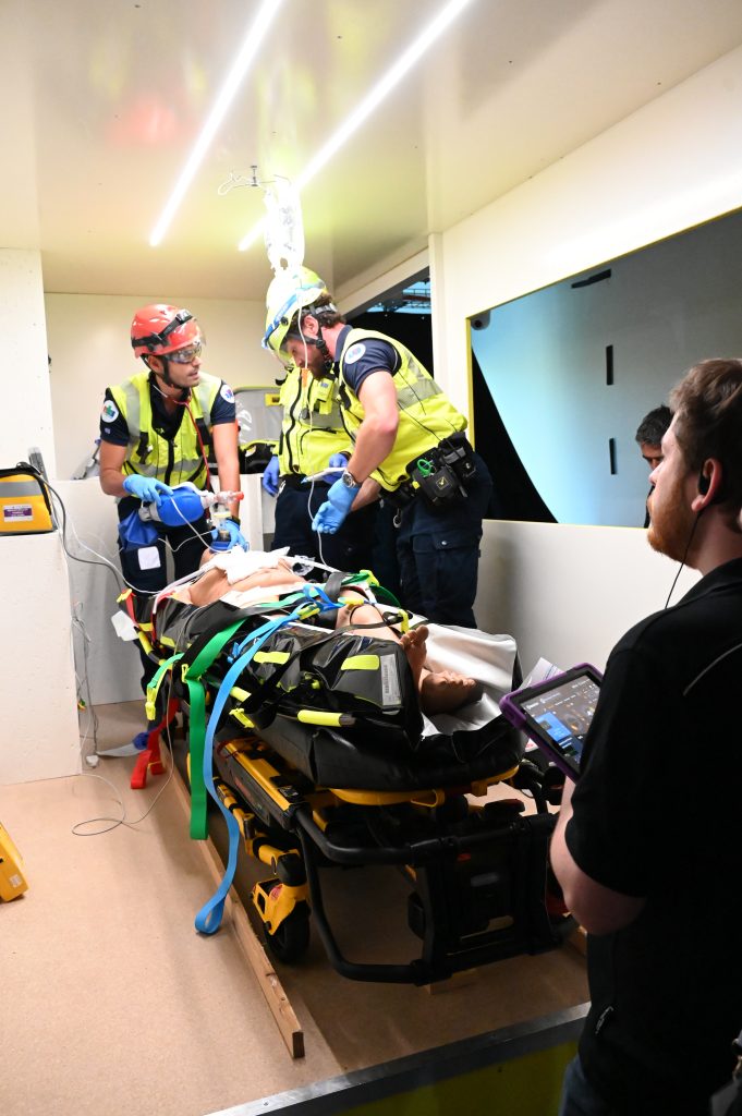 En este último, la dinámica preveía una simulación integrada 1:1, en la que el equipo prehospitalario entregaba al paciente al equipo hospitalario, representando toda la cadena de socorro en caso de emergencia.