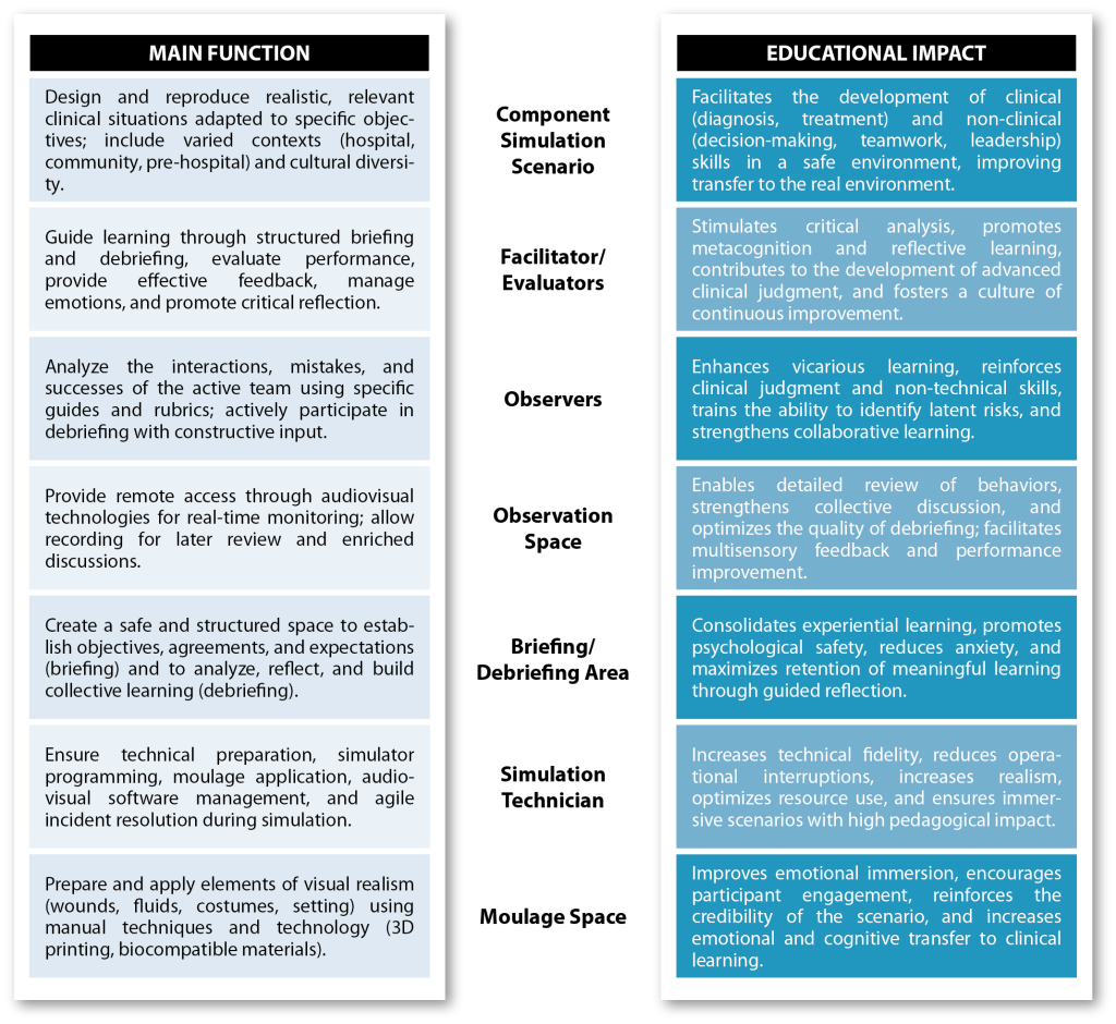- Facilitators/Evaluators: These are educational leaders who fulfill multiple roles: instructional designers, performance observers, and drivers of critical analysis during debriefing. They must be trained in feedback strategies, emotional management, and methodologies such as PEARLS or debriefing with good judgment [3,4].