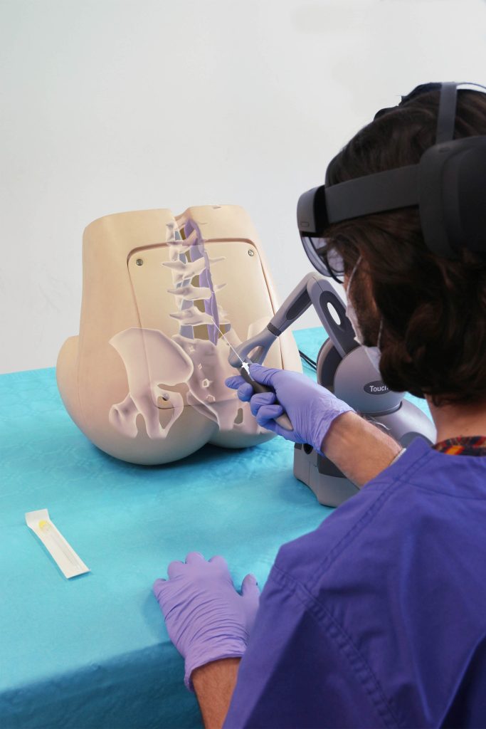 Sim&Care | Spine è uno strumento didattico che immerge l’utente in un ambiente altamente realistico: resistenza anatomica e interazione dell’ago con l’anatomia del paziente, realtà aumentata e visualizzazione trasparente delle principali strutture anatomiche, ambiente sonoro immersivo e simulazione delle emozioni del paziente, palpazione fisica su un manichino lombare. Formazione illimitata sulla puntura lombare, senza materiali di consumo e, soprattutto, senza rischi per il paziente.