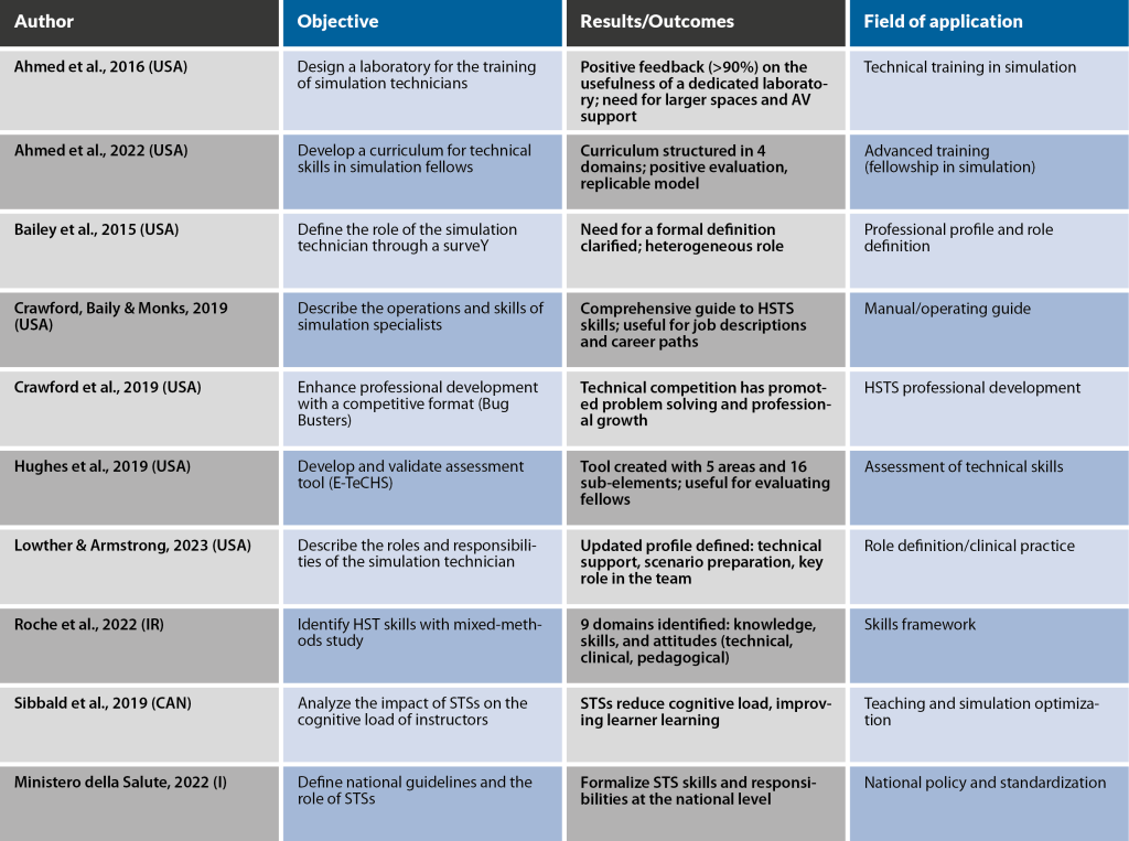 This review stems from the desire to contribute to the definition of this professional profile through a systematic analysis of the available literature, with the aim of identifying and characterizing the role of the Simulation Technology Specialist, paying particular attention to the skills considered essential, the existing training opportunities, and the different professional certification models adopted both nationally and internationally.